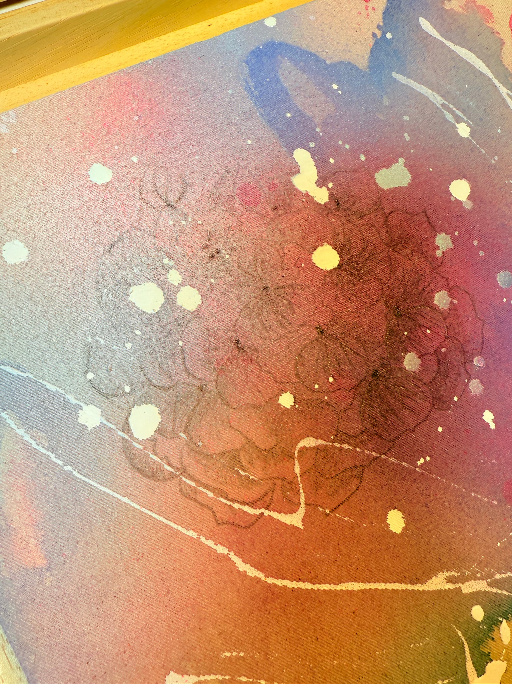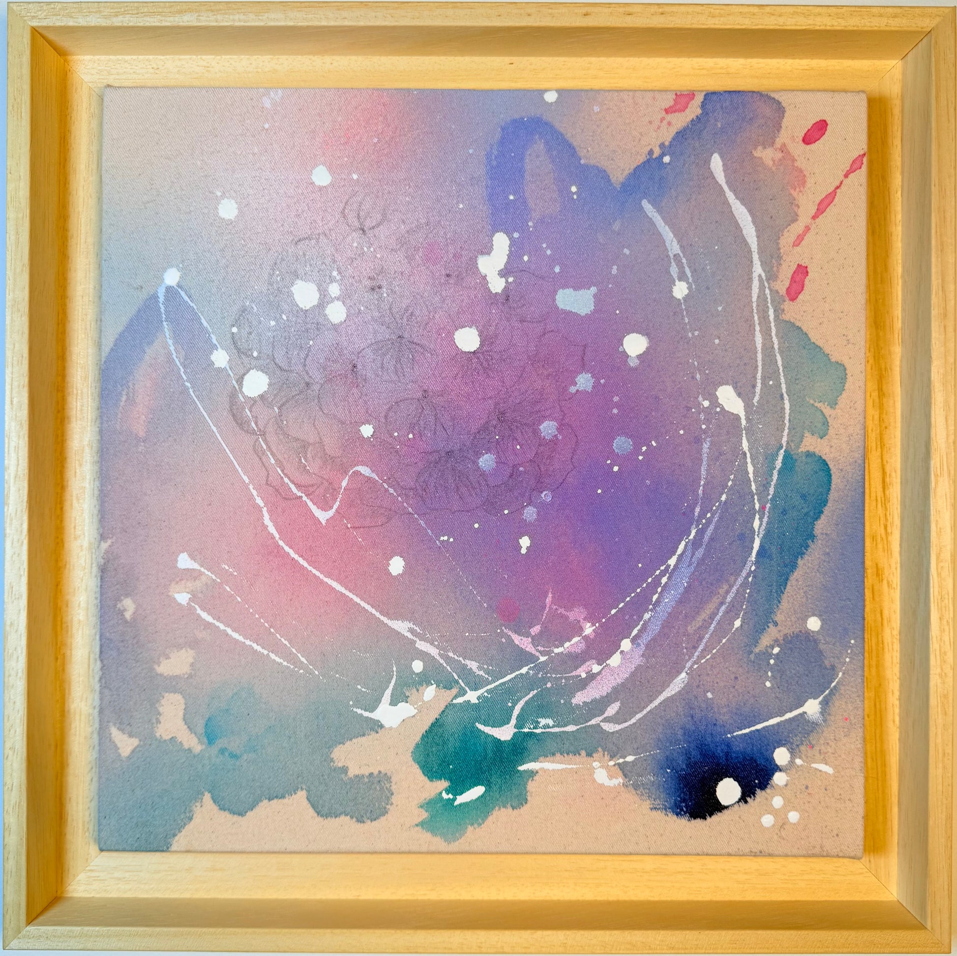 Kühle Blau- und Violettnuancen fangen die beruhigende Stimmung der Abendsonne ein. Die gezeichnete Hortensie steht als wiederkehrendes Symbol für Herkunft und Beständigkeit im Mittelpunkt. Sanfte Farbsäulen und spontane Weißsprenkel verleihen dem Werk eine meditative, eindrucksvolle Atmosphäre. Ein Bild, das den Tag sanft ausklingen lässt.