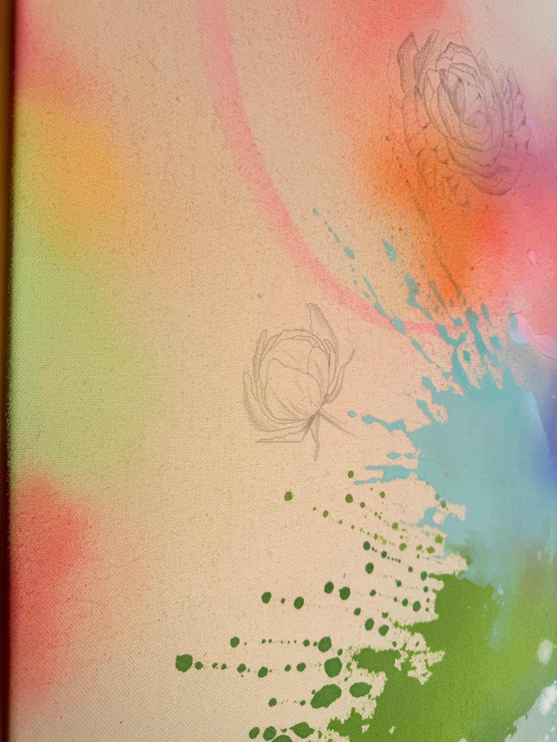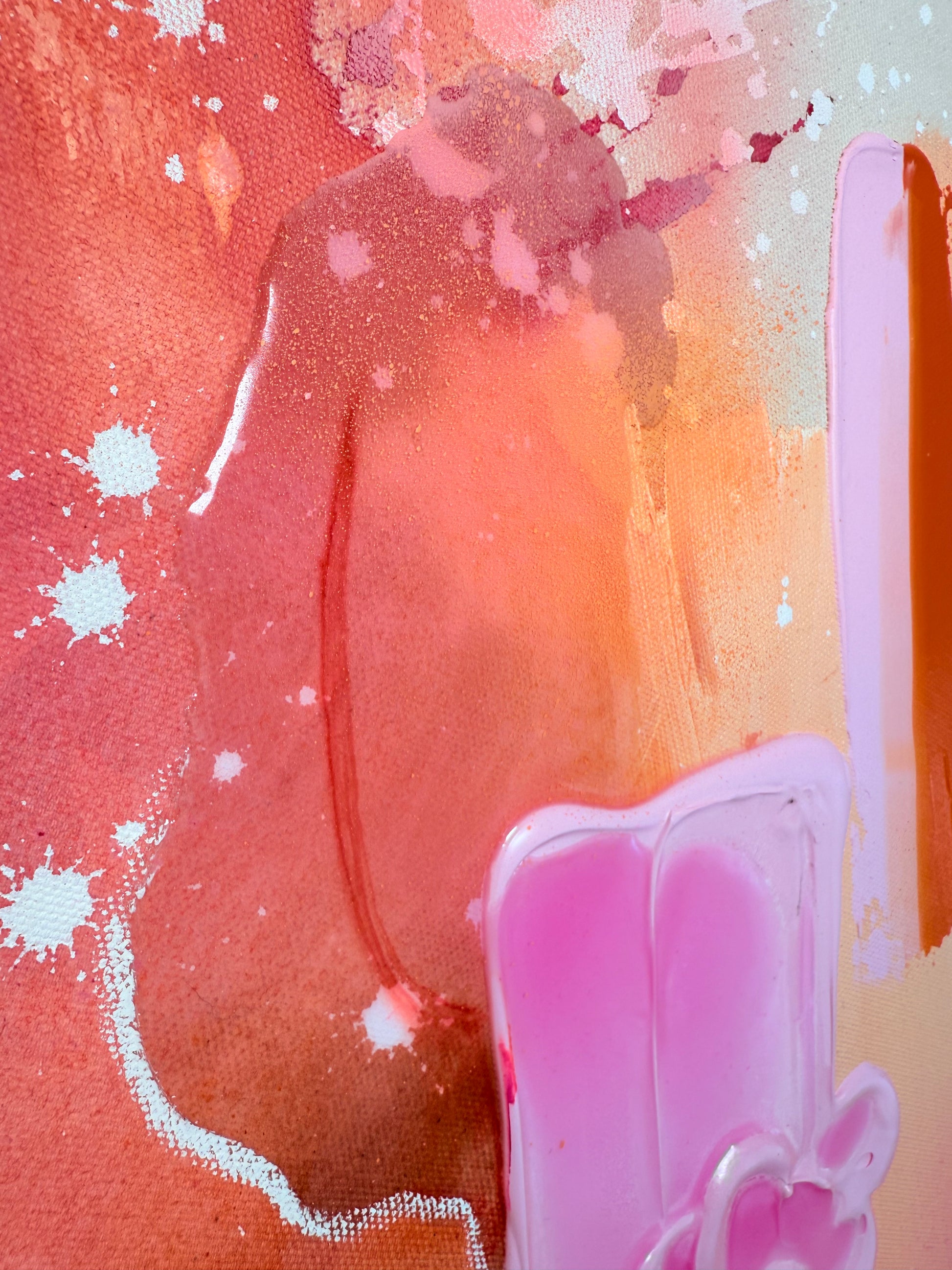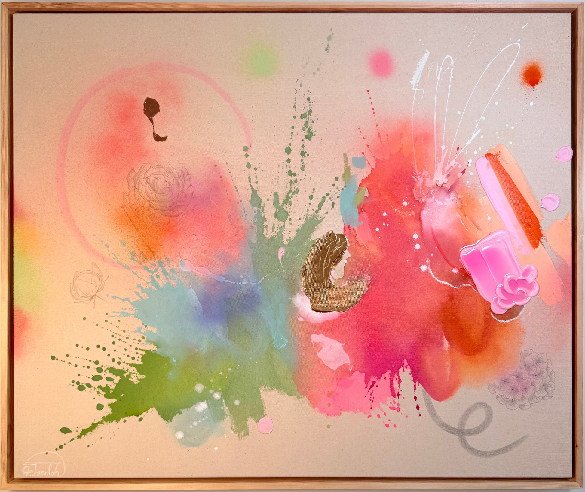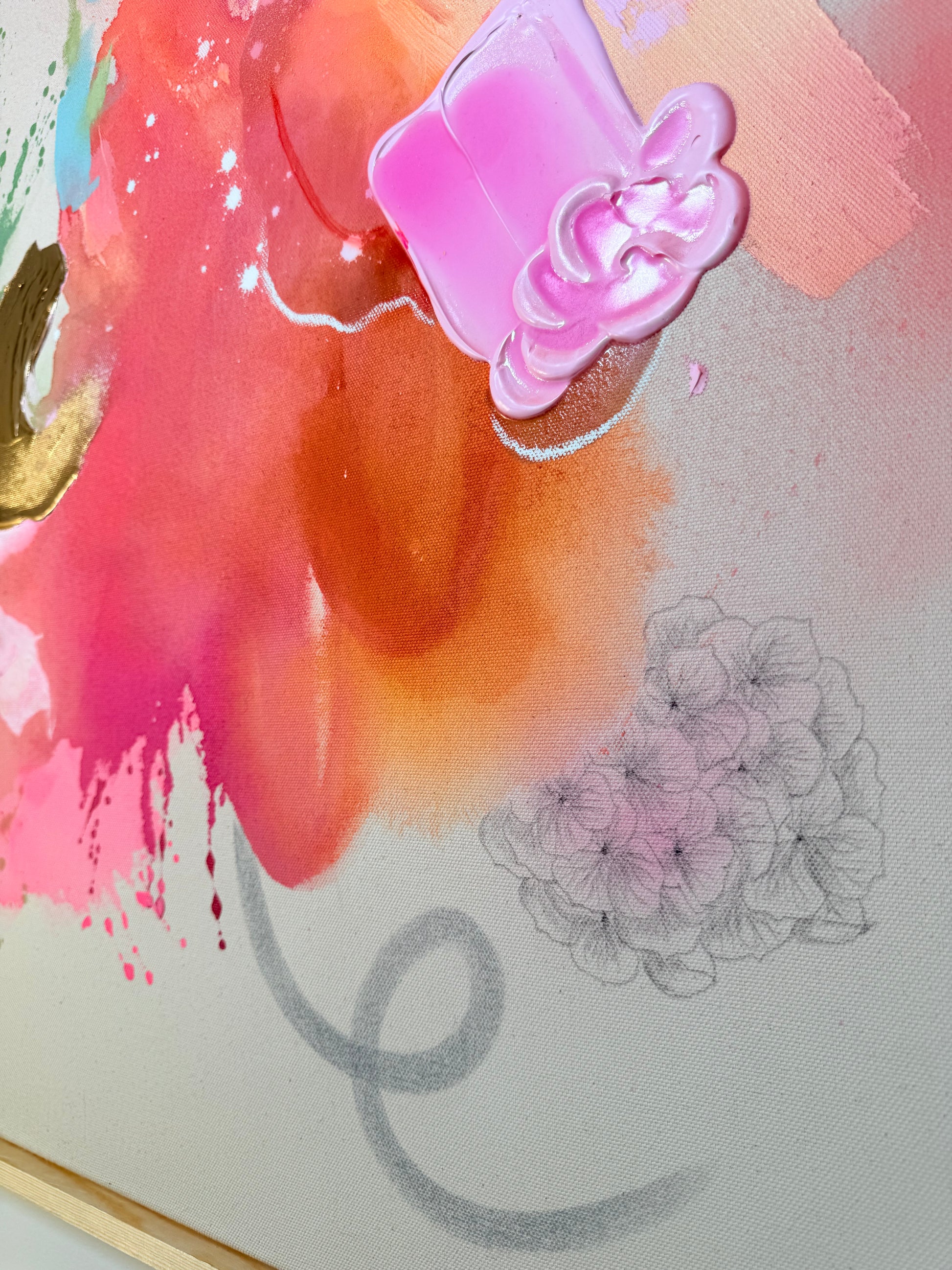 „Leichtes Herz“ vereint frische Mint- und Eukalyptustöne mit einem lebendigen, knalligen Orange zu einer harmonischen, gleichzeitig energiegeladenen Farbkomposition. Im Zentrum strahlt eine goldene Fläche, die das Werk warm durchleuchtet. Floralelemente wie die gezeichnete Hortensie sowie Darstellungen einer geschlossenen und einer geöffneten Pfingstrose symbolisieren Wachstum, Aufblühen und innere Leichtigkeit. Auf der rechten Seite fängt eine rosa-pink schimmernde Spiegelfläche das Licht ein und schafft bewegte, strahlende Reflexe.