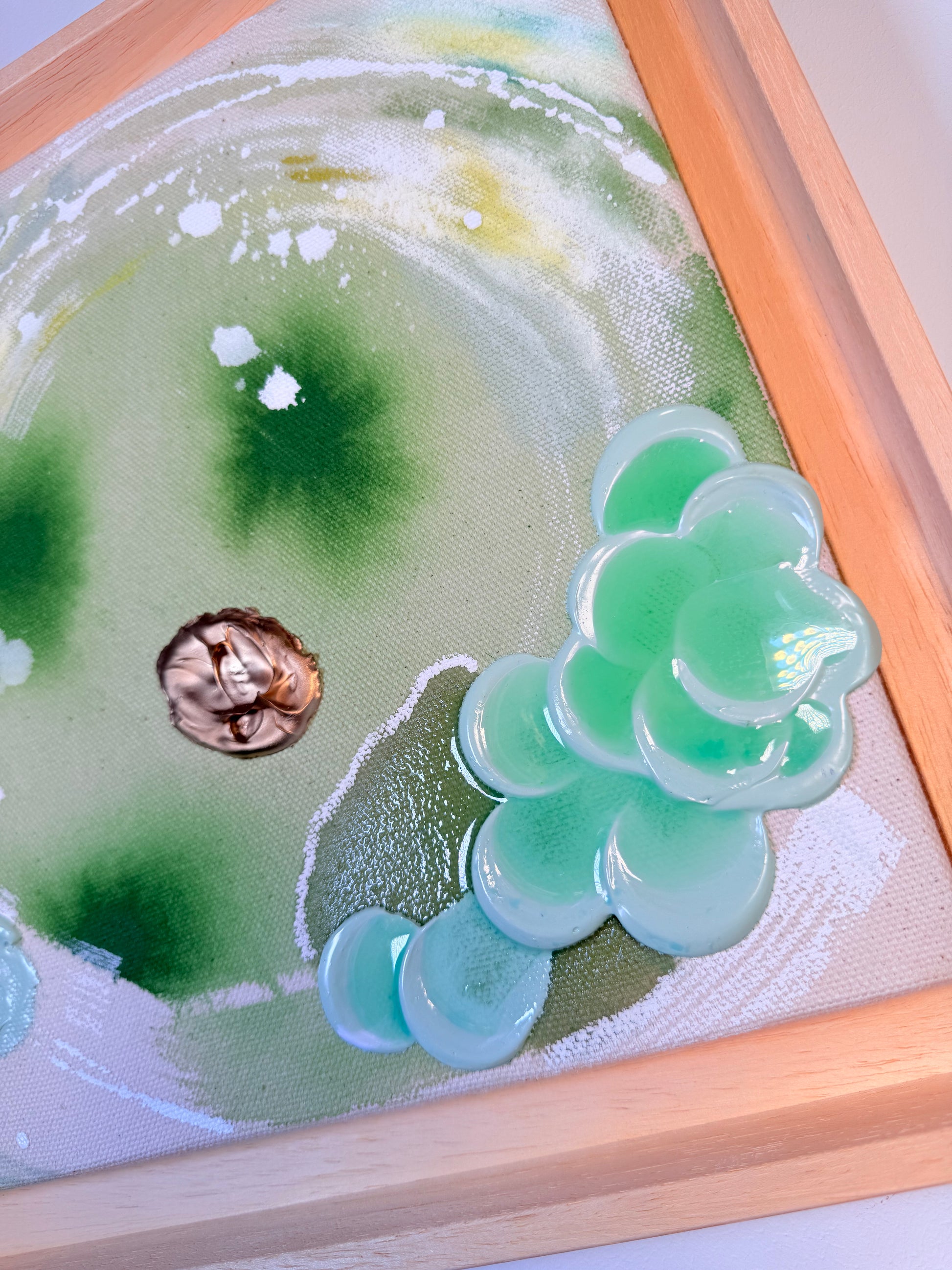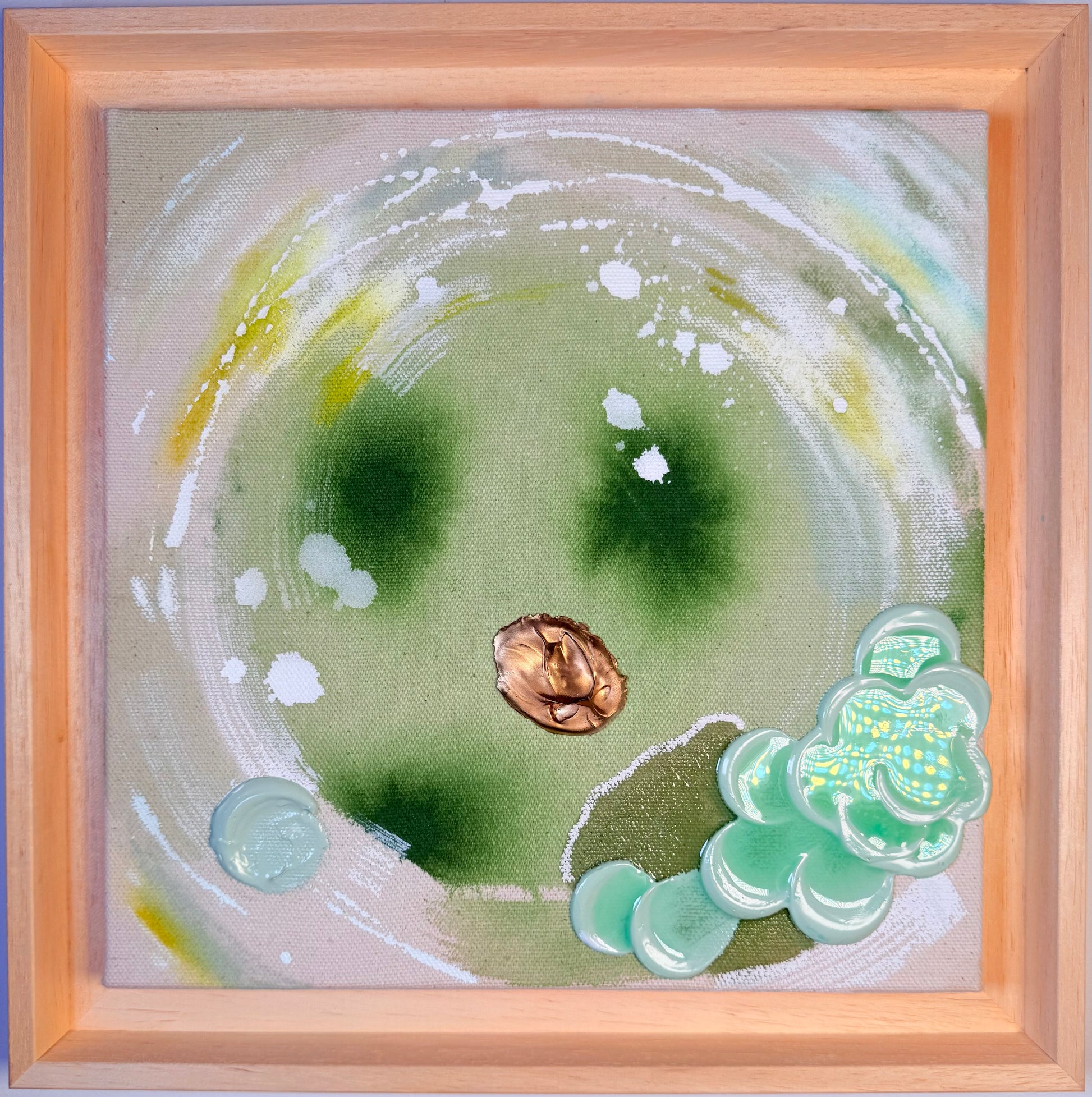 Diese Miniserie umfasst acht runde Kunstwerke, die durch ihre Spiegelflächen, metallischen Elemente und die charakteristische, kreisförmige Komposition verbunden sind. Die weißen Farbstritze stehen für die Spontanität des Moments, während die runden Formen und individuellen Farbstimmungen der einzelnen Werke an die Planeten unseres Sonnensystems erinnern. Jedes Bild folgt einer ähnlichen Grundstruktur und entfaltet dennoch durch seine eigene Farbwelt einen ganz besonderen Charakter. Die Minis wirken sowohl einzeln als auch in Kombination – zu zweit, zu viert oder als komplette Serie – und gewinnen durch die integrierte Spiegelfläche eine einzigartige, lebendige Präsenz. Ein hochwertiger Rahmen ist im Preis inbegriffen.