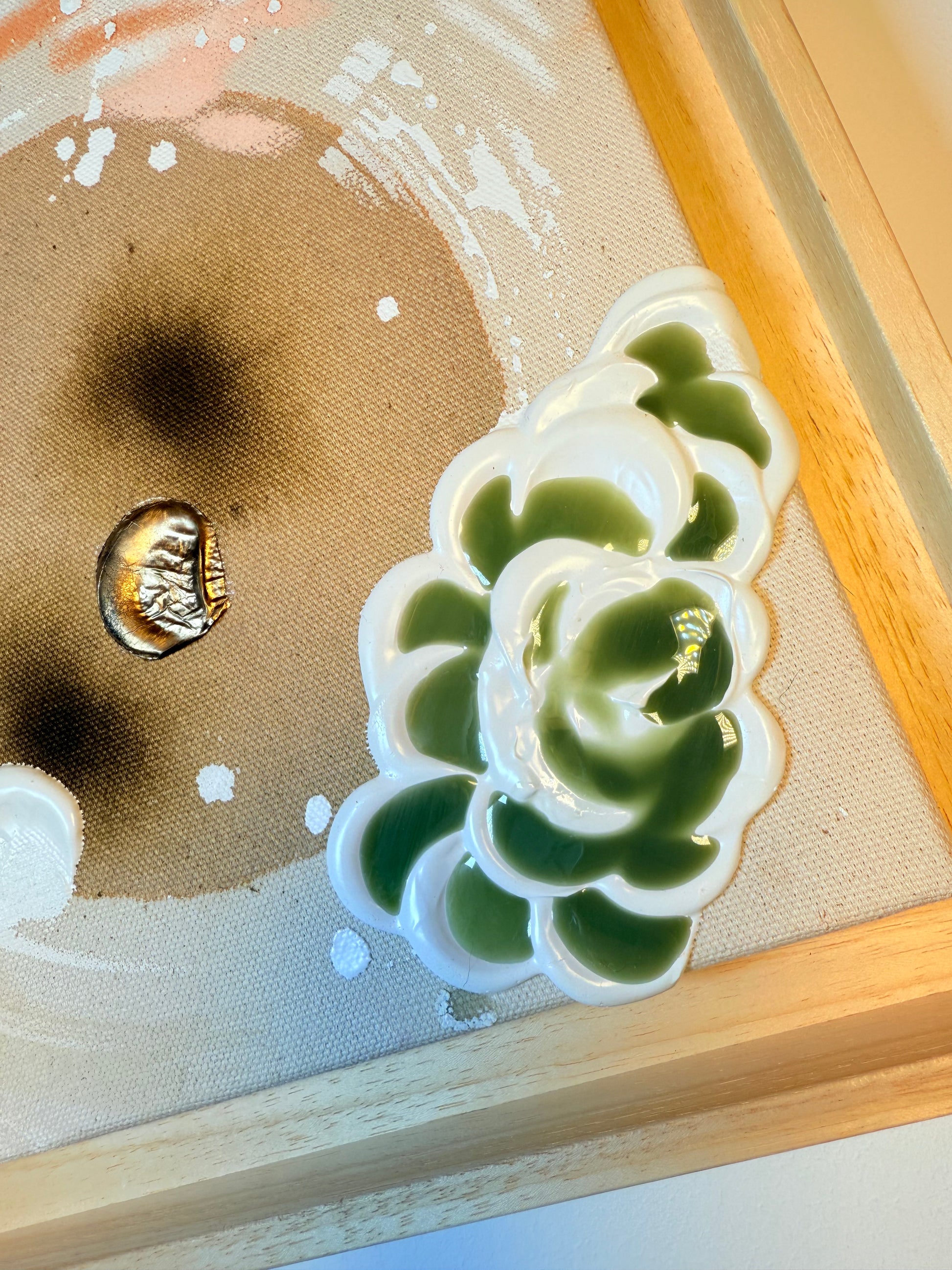 Diese Miniserie umfasst acht runde Kunstwerke, die durch ihre Spiegelflächen, metallischen Elemente und die charakteristische, kreisförmige Komposition verbunden sind. Die weißen Farbstritze stehen für die Spontanität des Moments, während die runden Formen und individuellen Farbstimmungen der einzelnen Werke an die Planeten unseres Sonnensystems erinnern. Jedes Bild folgt einer ähnlichen Grundstruktur und entfaltet dennoch durch seine eigene Farbwelt einen ganz besonderen Charakter. Die Minis wirken sowohl einzeln als auch in Kombination – zu zweit, zu viert oder als komplette Serie – und gewinnen durch die integrierte Spiegelfläche eine einzigartige, lebendige Präsenz. Ein hochwertiger Rahmen ist im Preis inbegriffen.