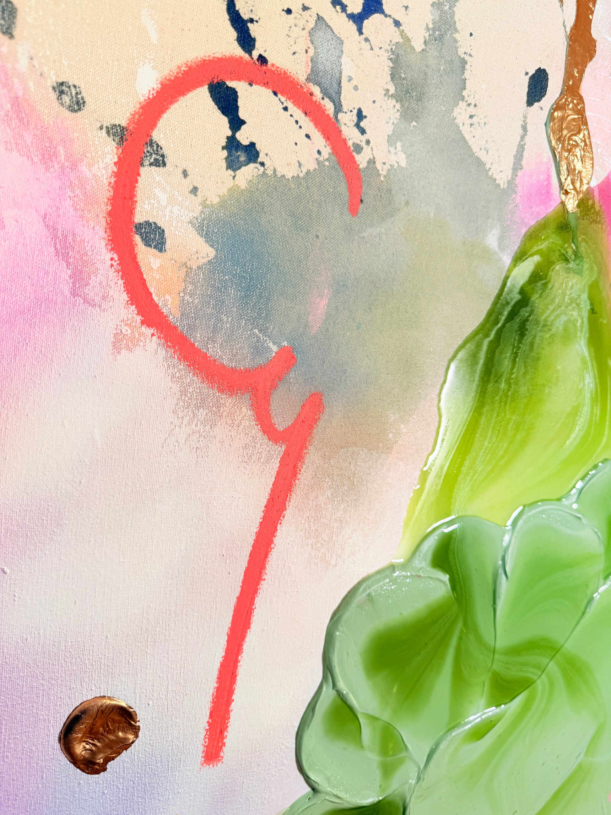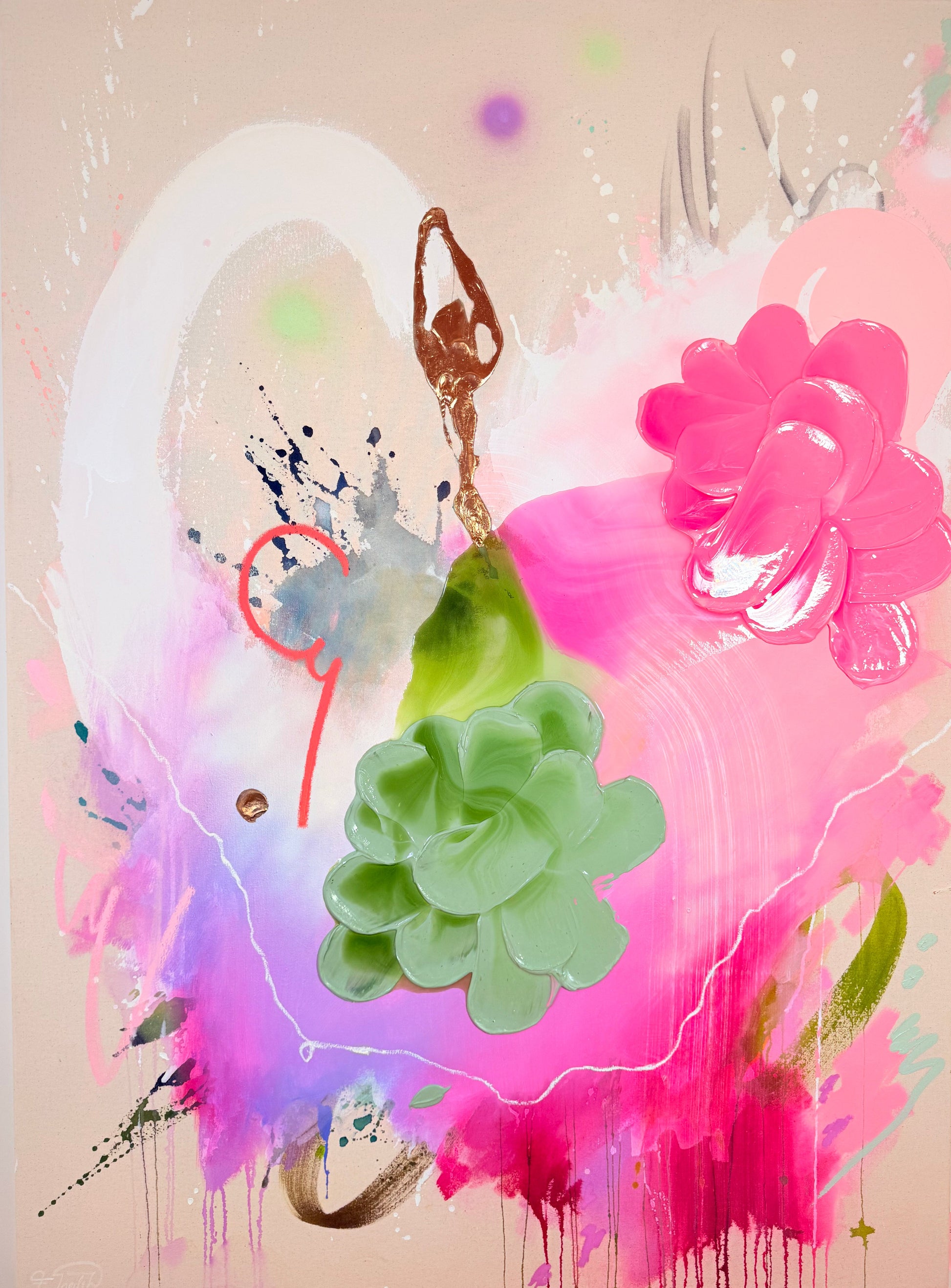 „Tänzerin“ zeigt in der oberen Bildmitte eine goldene Strukturform, die an die anmutige Silhouette einer Ballerina erinnert. Links strahlt eine grüne Spiegelfläche, rechts eine rosafarbene – beide reflektieren das Licht unterschiedlich und treffen sich in der Mitte, wo ihre Reflexe ineinander übergehen und eine harmonische Verbindung eingehen.