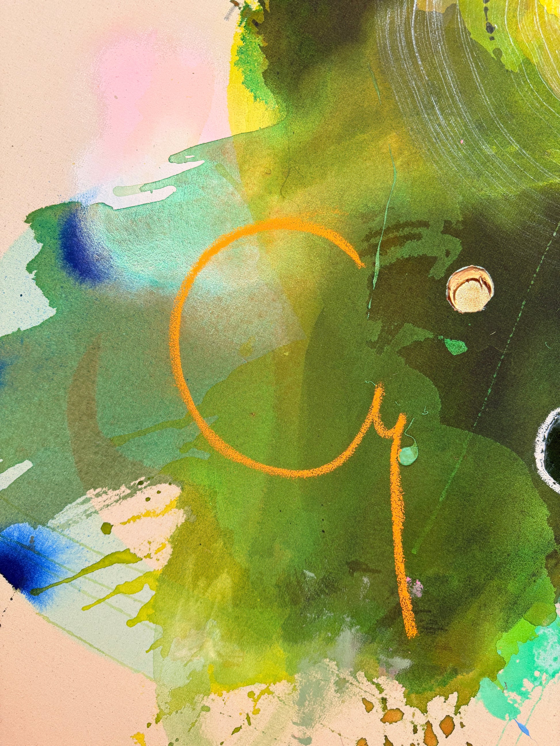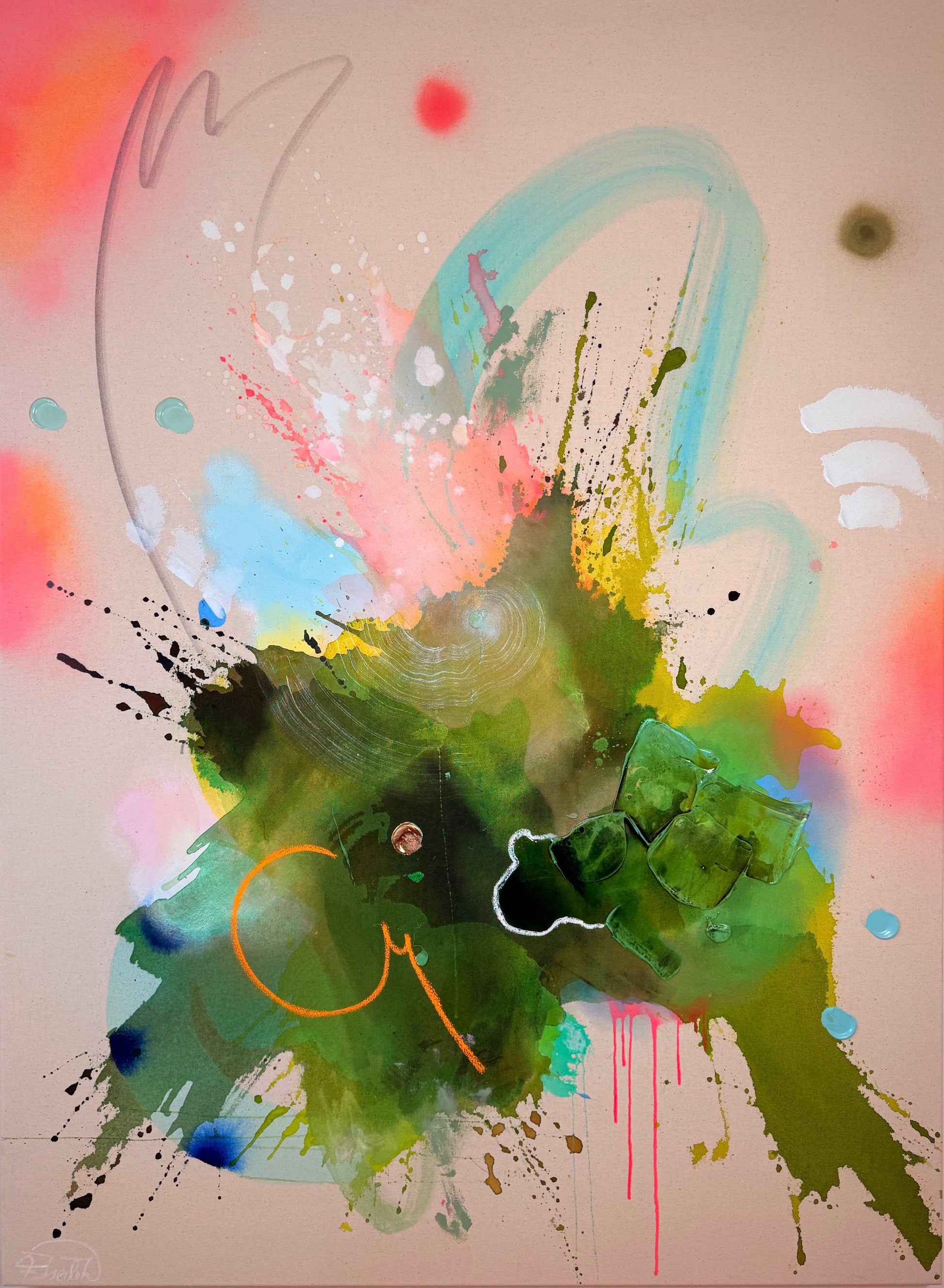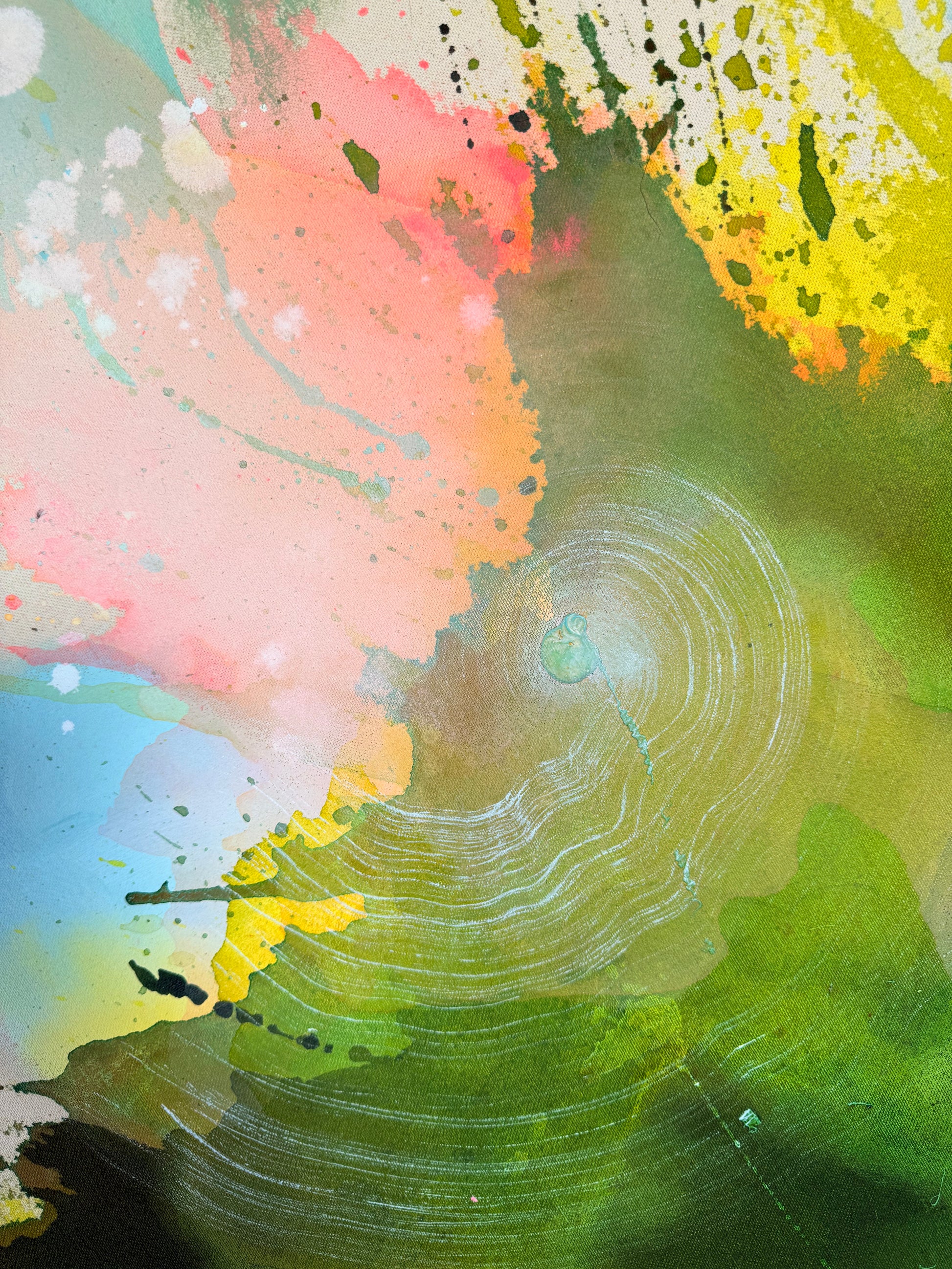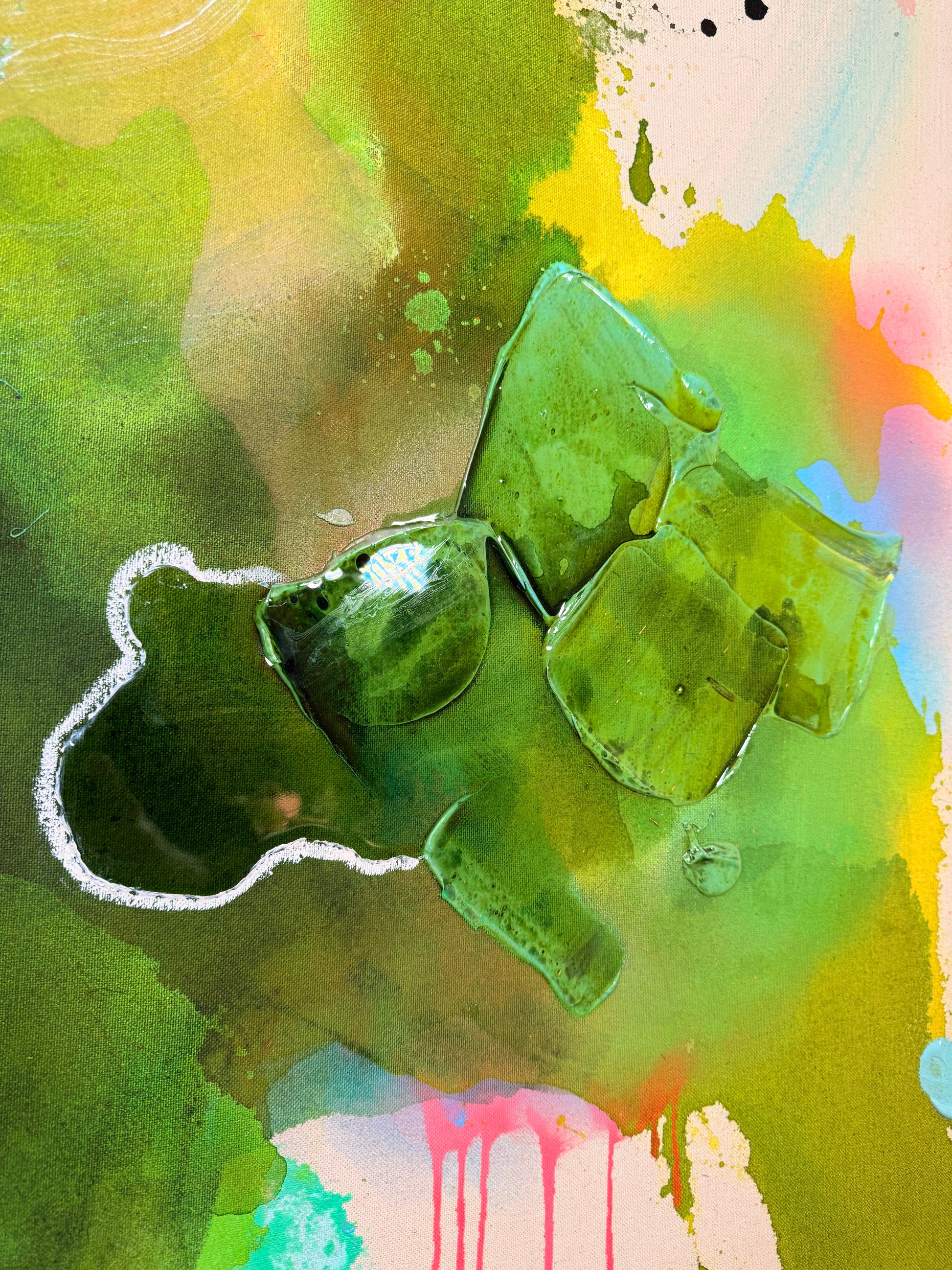 „Waldesruh“ ist in lebendigen Grüntönen gehalten und trägt im Zentrum eine grüne Spiegelfläche, die das Licht sanft reflektiert. Inspiriert von einem stillen Waldspaziergang fängt das Werk den Moment ein, in dem Sonnenstrahlen durch den Kronenraum brechen und eine Atmosphäre von Ruhe, Klarheit und natürlicher Kraft entstehen lassen.